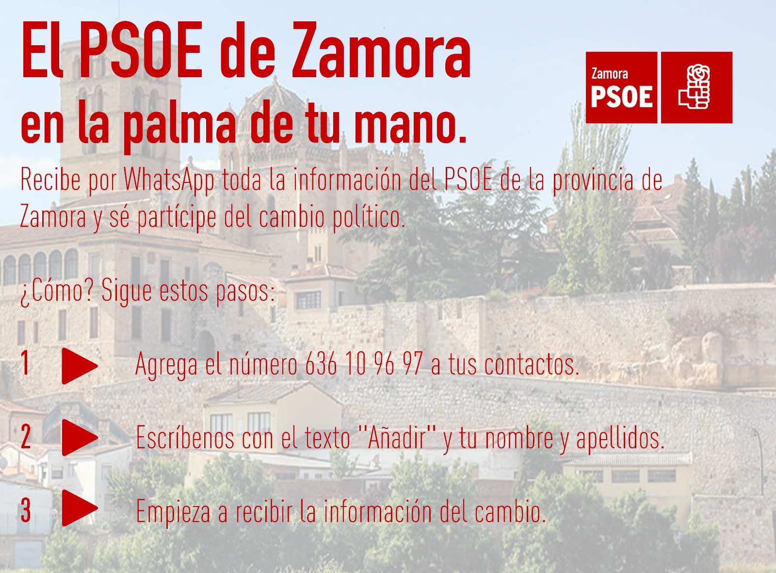 “Recibe por WhatsApp toda la información del PSOE en la provincia de Zamora y sé partícipe del cambio” en el número 636 10 96 97