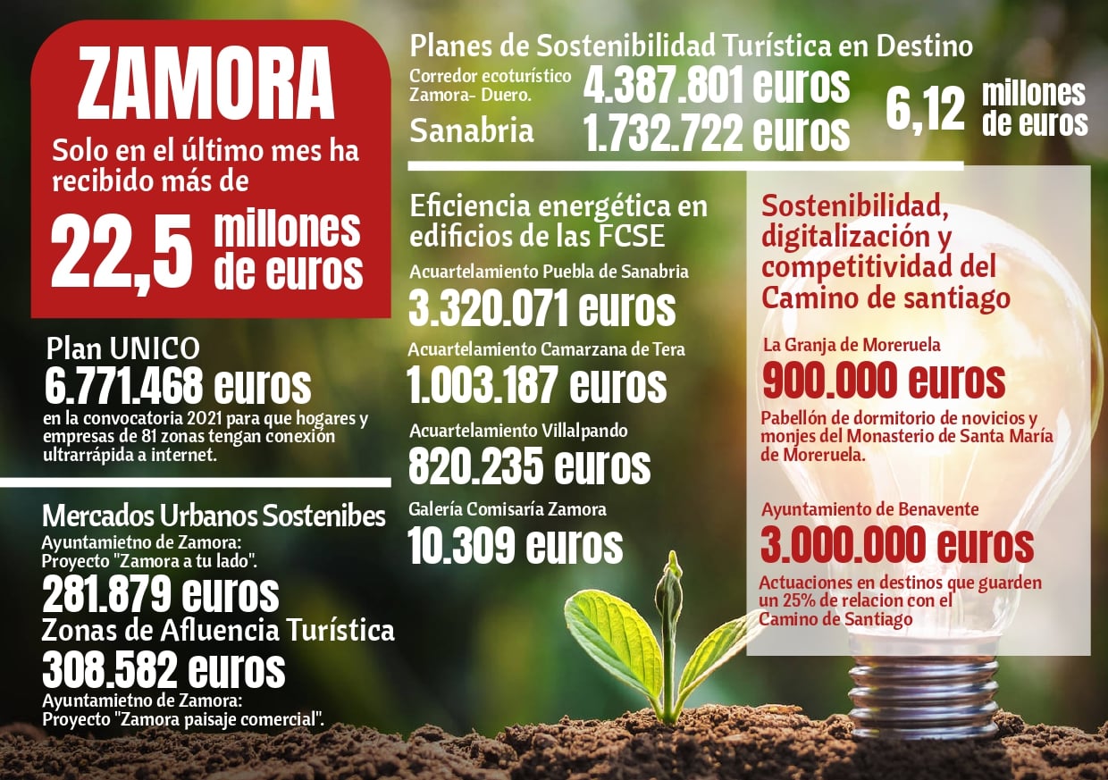 En lo específico, solamente en el último mes, algo que venimos reclamando en la Junta y en la Diputación, que era preciso hacer oficinas territoriales en toda la Comunidad para que se pudiera acceder de una manera más efectiva a los Fondos Europeos, sin que Junta y Diputación lo hayan hecho, Zamora ha recibido en el último mes 22,5 millones de euros.