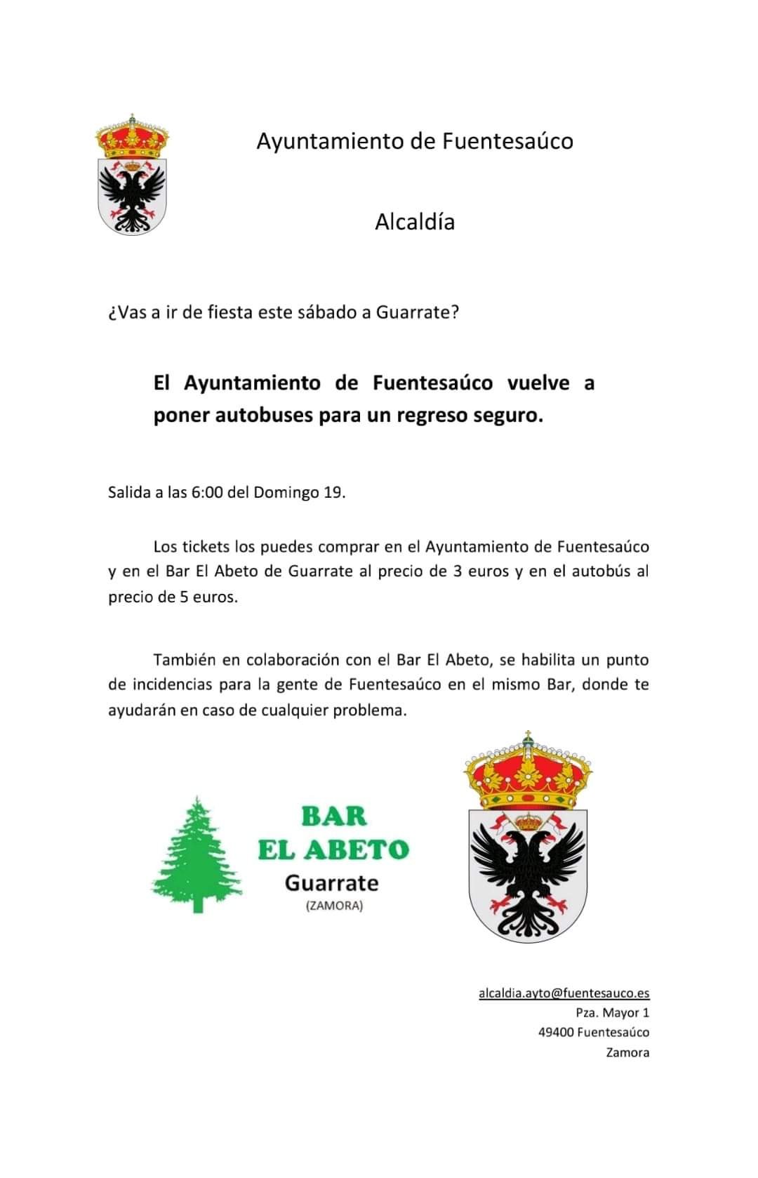 El autobús tendrá salida a las 6:00 h. desde Guarrate hasta la Plaza de Fuentesaúco, con un precio de 3 euros en el Ayuntamiento saucano y en el Bar Abeto de Guarrate, empresa colaboradora, y 5 euros en el autobús
